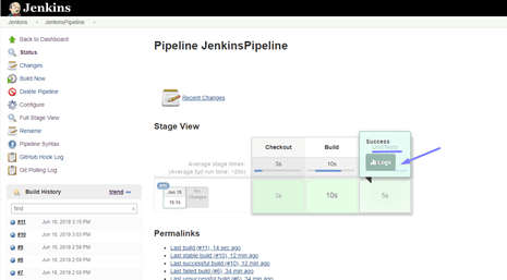 Once the build trigger finishes execution, it showed the status on the left side panel. You can click on the build on the left side while it is executing to know the live status of the build or when it is complete. Click on the build and we see that our pipeline headers like Checkout, Build and “UnitTests” are listed in a sequential way telling the time each process took. Since all the processes run successfully including the tests. You can also check the log file we intended to create after running the tests by clicking on the Logs on “UnitTests” completed process as shown below.