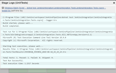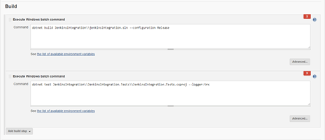 bat ‘dotnet test JenkinsIntegration\\JenkinsIntegration.Tests\\JenkinsIntegration.Tests.csproj –logger:trx’